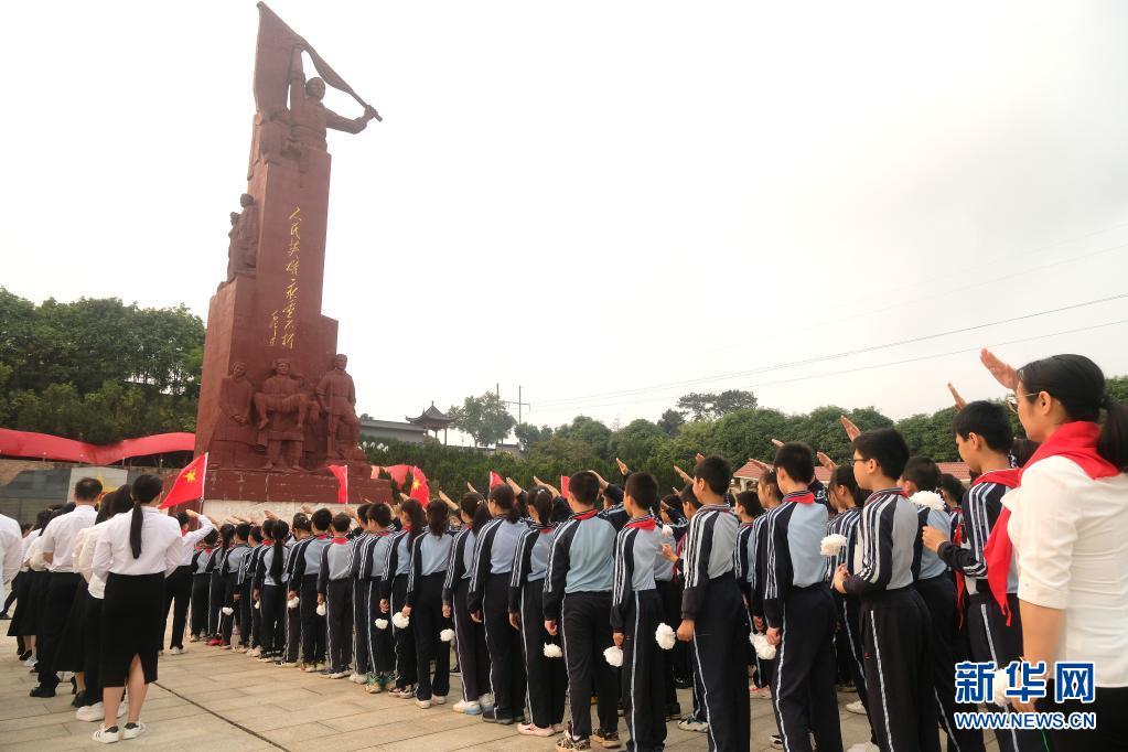 4月4日,少先隊員在位于南寧市的廣西壯族自治區烈士陵園向英雄紀念碑敬禮。