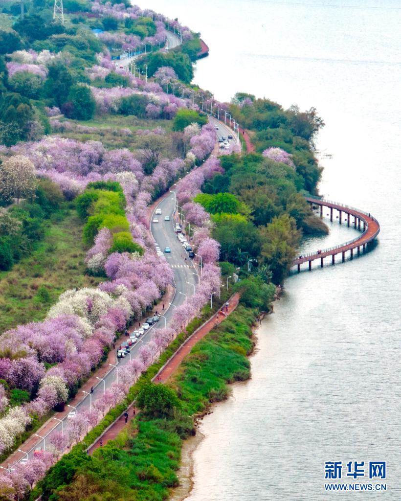 連日來,廣西柳州市種植的洋紫荊迎來盛花期,粉色的花朵與道路相互映襯,構成一幅美麗的春日畫卷。