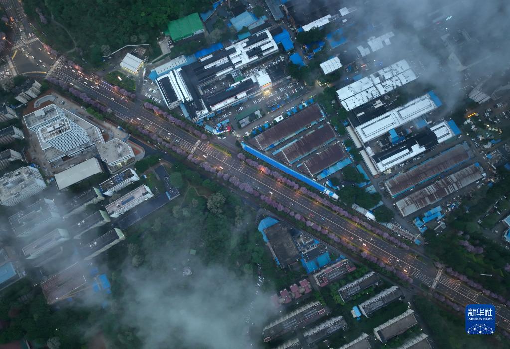 4月10日在廣西柳州市洋紫荊盛開的學院路上拍攝的車流(無人機照片)。
