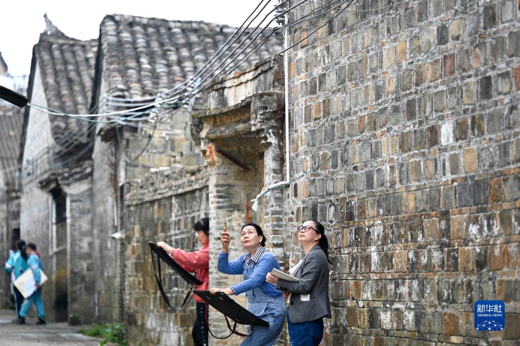 4月10日,在柳城縣古砦仫佬族鄉大戶村灘頭屯,繪畫愛好者在民居旁寫生。