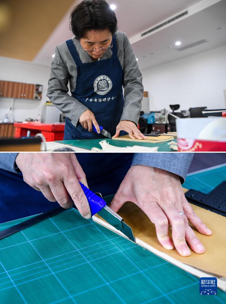 拼版照片:4月14日,在廣西壯族自治區圖書館古籍保護中心的工作室內,黃玉杏給修補好的古籍裁邊。