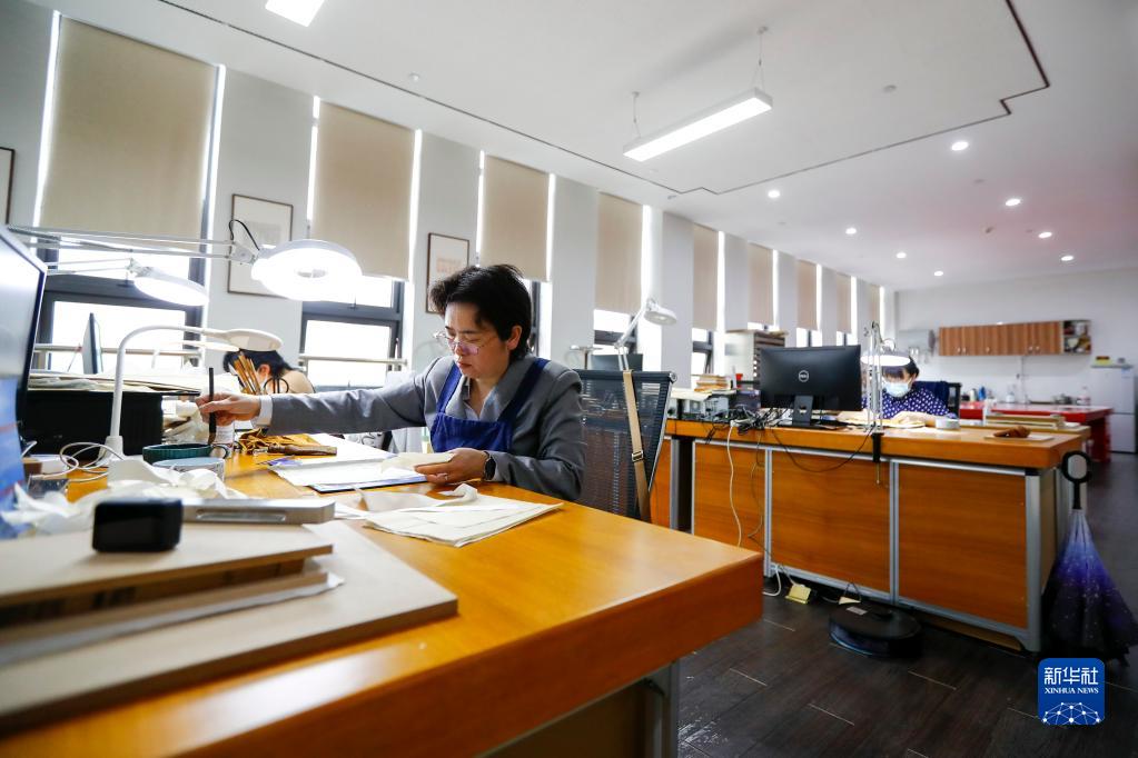 4月14日,在廣西壯族自治區圖書館古籍保護中心的工作室內,黃玉杏正在修復古籍。