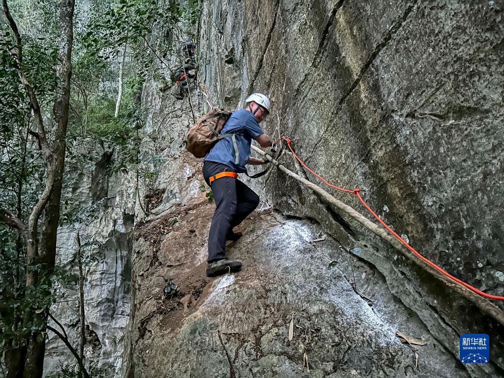 3月15日,聯合科考隊成員、廣西植物研究所的王斌在科考途中攀爬巖壁。