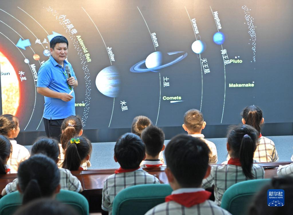 當日,廣西南寧市逸夫小學賢賓校區舉行科學家進校園活動。孩子們在中國科學院國家空間科學中心研究員、中國航天科普大使劉勇的帶領下,了解天體系統知識,播種下空間科學的夢想。