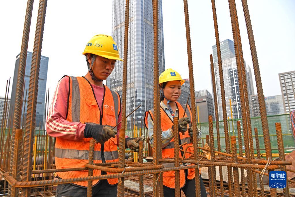陸貞平與妻子王運瓊在廣西南寧市良慶區五象大道中建三局一公司南寧中銀金融中心項目建設工地綁鋼筋(4月19日攝)。