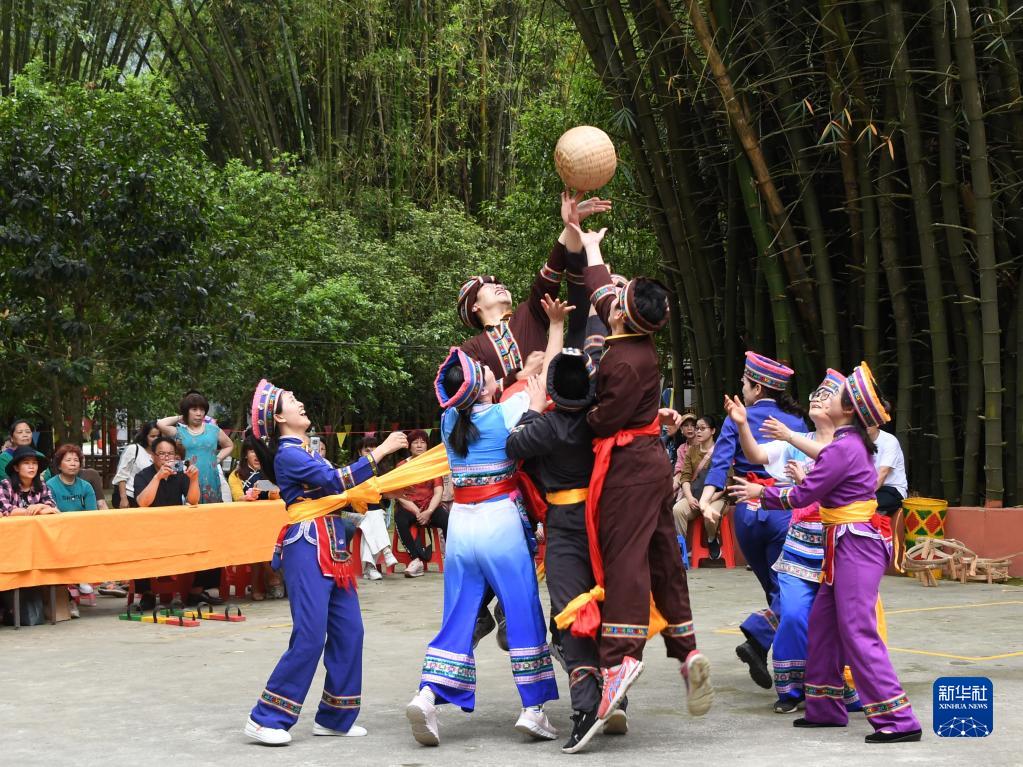 4月21日,在羅城縣米椎林景區,人們參加仫佬竹球比賽。