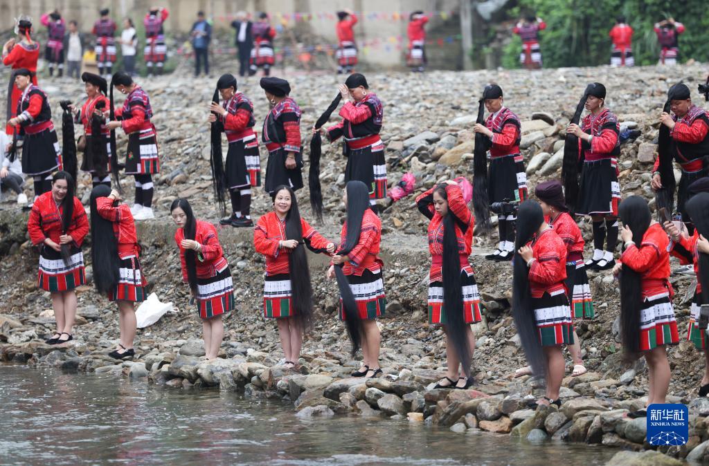 當日是農歷三月初三,廣西桂林市龍勝各族自治縣黃洛瑤寨舉行“三月三龍脊長發節”活動,吸引游客前來參觀游覽。黃洛瑤寨的紅瑤族婦女有世代相傳的蓄發習俗,平均頭發長度達1.7米,最長的有2.72米。