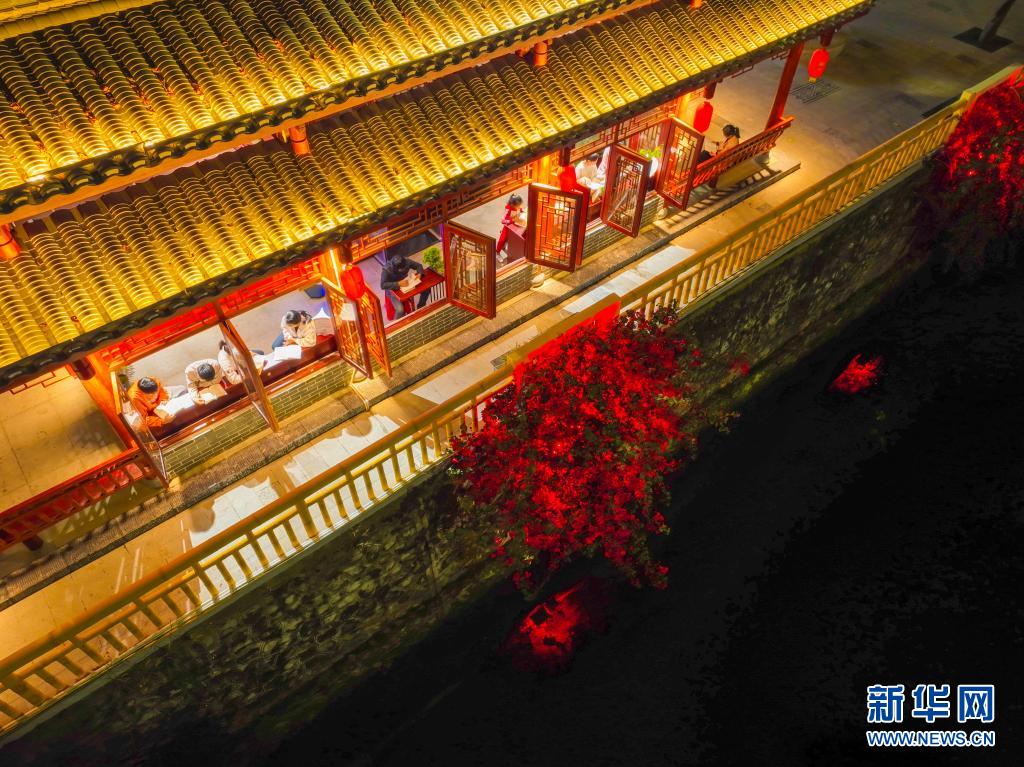 4月20日晚,人們在廣西金秀瑤族自治縣金秀鎮榮興社區24小時智慧書屋內讀書(無人機照片)。