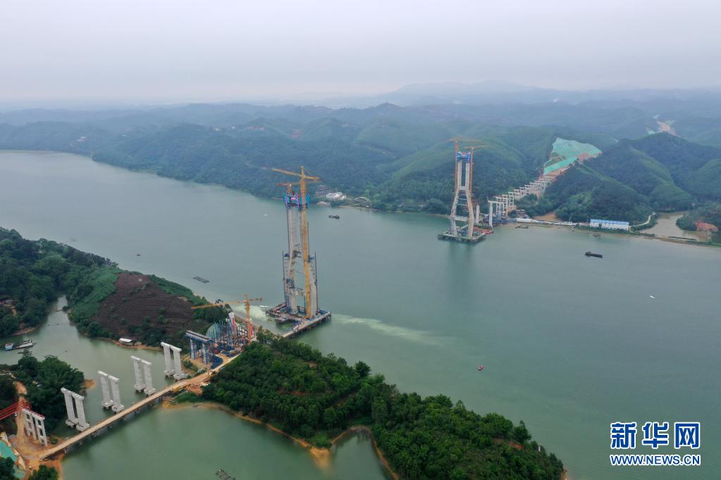 這是已經實現主塔封頂的廣西上橫高速公路西津郁江特大橋(4月24日攝,無人機照片)。