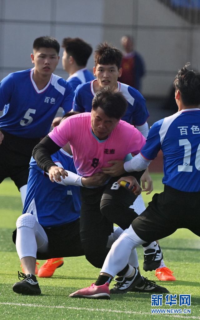 4月26日,廣西崇左市隊選手和廣西百色市隊選手在比賽中爭搶。