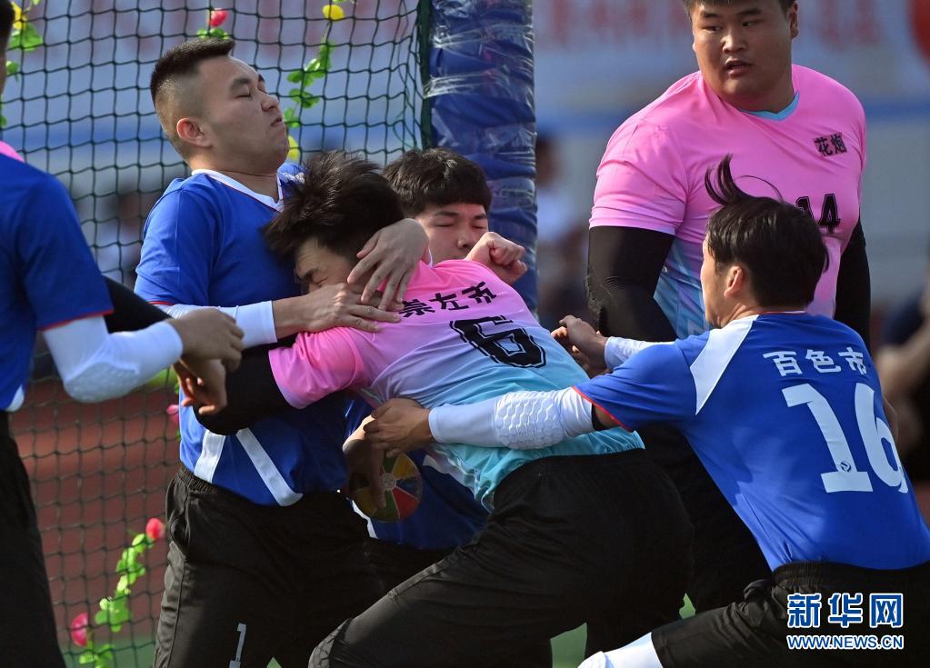 4月26日,廣西崇左市隊選手和廣西百色市隊選手在比賽中爭搶。
