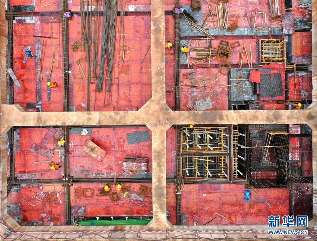 4月29日,工人在廣西南寧市良慶區中建三局一公司南寧中銀金融中心項目建設工地忙碌(無人機照片)。