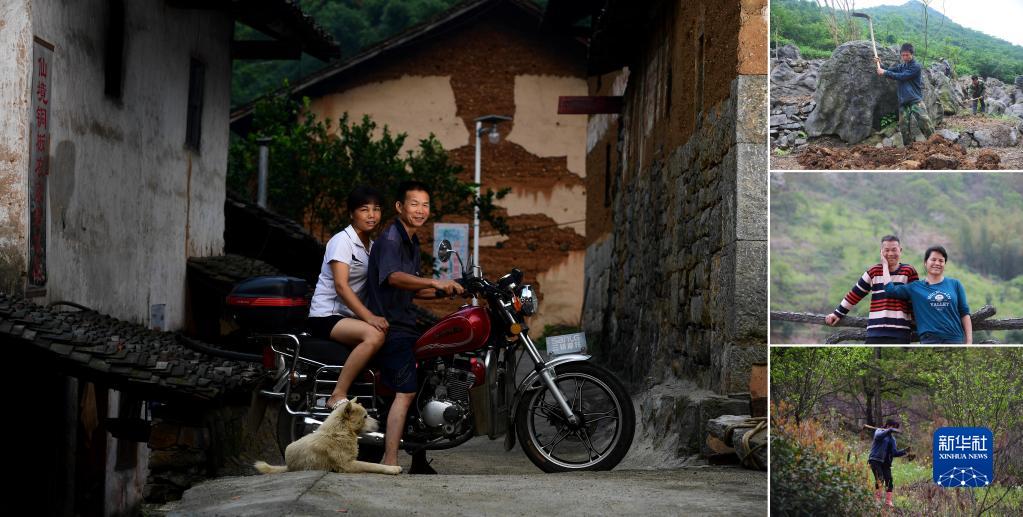 拼版照片:左圖為廣西融安縣東起鄉銅板屯55歲的村民龍革雄(右)和妻子羅桂枝(2017年8月1日攝);右上圖為龍革雄和村民們在山上種樹(2013年5月15日攝);右中圖為龍革雄和妻子羅桂枝合影(2022年3月20日攝);右下圖為羅桂枝在山上種樹(2021年3月3日攝)。