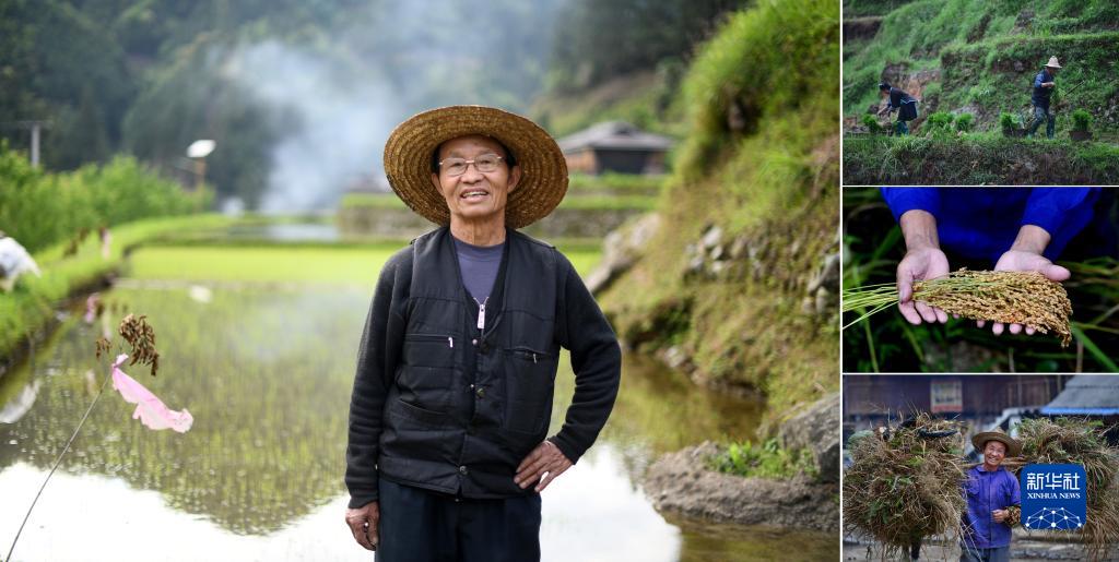 拼版照片:左圖為廣西融水苗族自治縣桿洞鄉烏英苗寨73歲的老人梁安合(2023年4月25日攝);右上圖為梁安合(右)和老伴在田間插秧(2020年5月21日攝);右中圖為梁安合展示收獲的稻谷(2020年9月10日攝);右下圖為梁安合勞作歸來(2019年3月25日攝)。