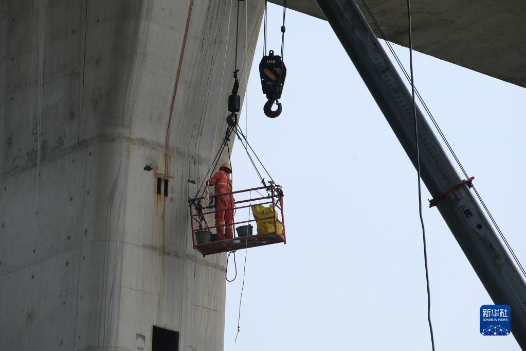 工人在廣西龍門大橋項目建設工地施工(5月1日攝)。