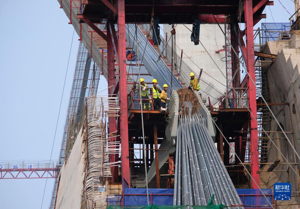 工人在廣西龍門大橋項目建設工地進行主纜緊纜施工(5月1日攝)。