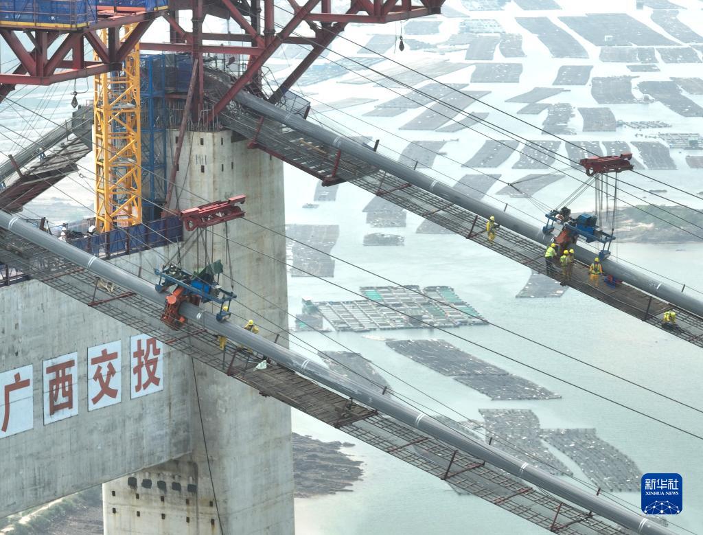 近日,位于欽州市的廣西最長跨海大橋——龍門大橋項目建設全面進入上部結構施工階段,其中龍門大橋主通航孔橋已完成主纜的架設,目前正在進行緊纜施工。