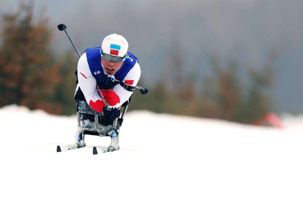 2022年3月11日,北京2022年冬殘奧會殘奧冬季兩項男子長距離(坐姿)比賽在河北張家口國家冬季兩項中心舉行。中國選手劉夢濤在比賽中。新華社記者 賈浩成 攝