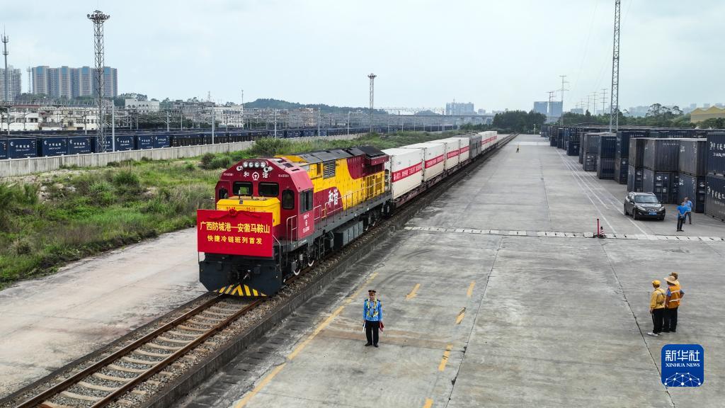 當日,首趟“防城港-馬鞍山”冷鏈班列搭載8個冷鏈集裝箱從廣西防城港站發車,前往安徽馬鞍山站。這批貨物將經馬鞍山市分撥至周邊的生鮮市場,讓當地百姓可以品嘗到來自北部灣的海鮮產品。至此,廣西防城港開行的冷鏈班列線路升至9條。
