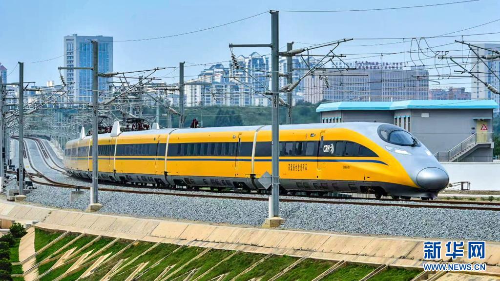 5月16日 ,CRH380AJ-0203高速綜合檢測列車對貴南高鐵全線進行逐級提速試驗,以時速180公里的速度級,對南寧東至荔波站區間高鐵沿線的軌道、信號、通信、電務、綜合接地等多個項目進行檢測。列車因車身涂裝成醒目的黃色,又被稱為“黃醫生”。