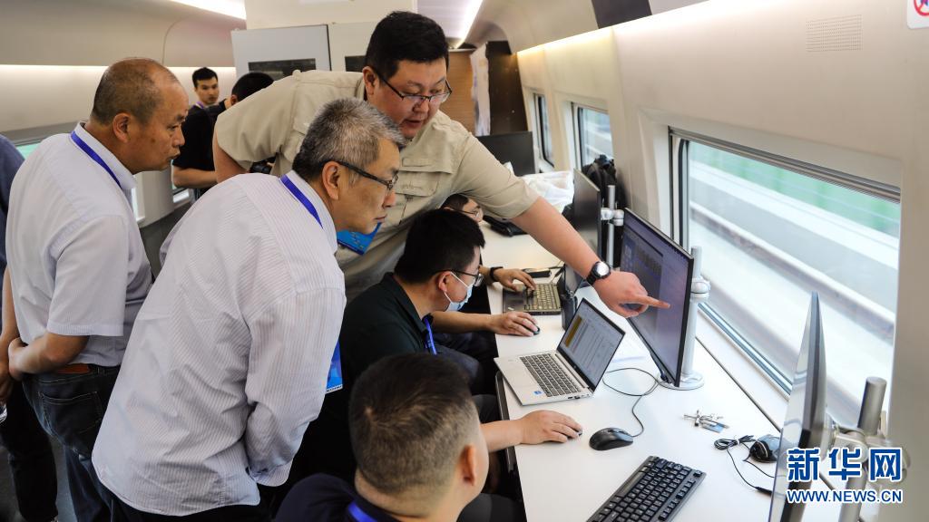 5月16日,在高速綜合檢測列車上,聯調聯試工作人員在分析測試數據。