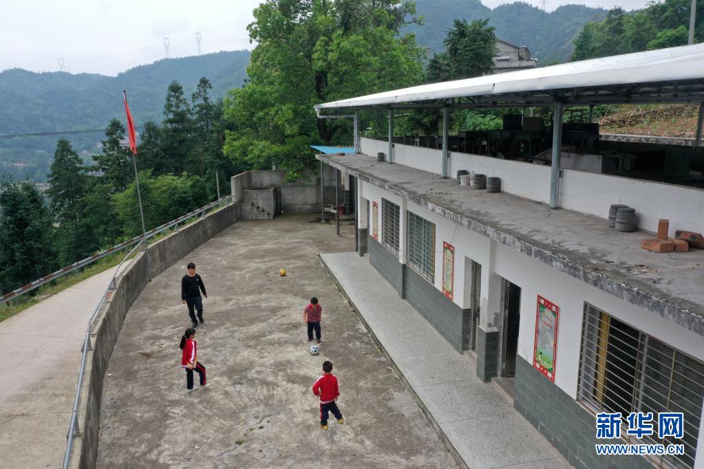 5月17日,在廣西靈川縣海洋鄉中心岐教學點,蔡教宏和學生在課間做游戲(無人機照片)。