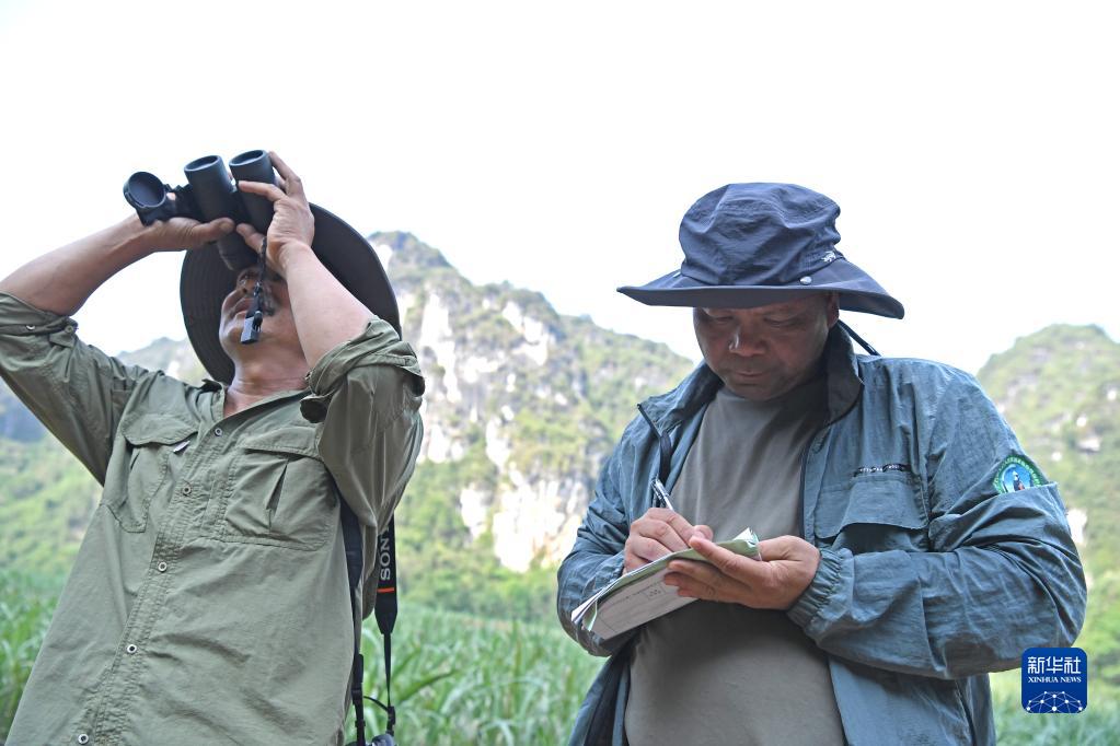蒙育寧(右)和同事在岜盆自然保護區記錄猴群生活情況(5月18日攝)。