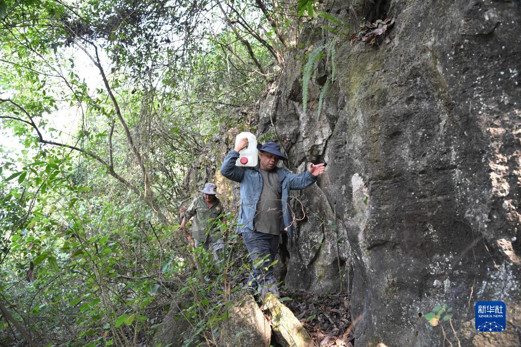 岜盆自然保護區屬于喀斯特巖溶山區,在降雨量較少的時候,白頭葉猴就會遇到飲水困難。為此,蒙育寧和護林員一起在白頭葉猴平時喝水的地方分別放置了水盆、水缸,遇到山上少雨的時候,大家就一起扛著幾十公斤重的大水壺上山給猴子送水。