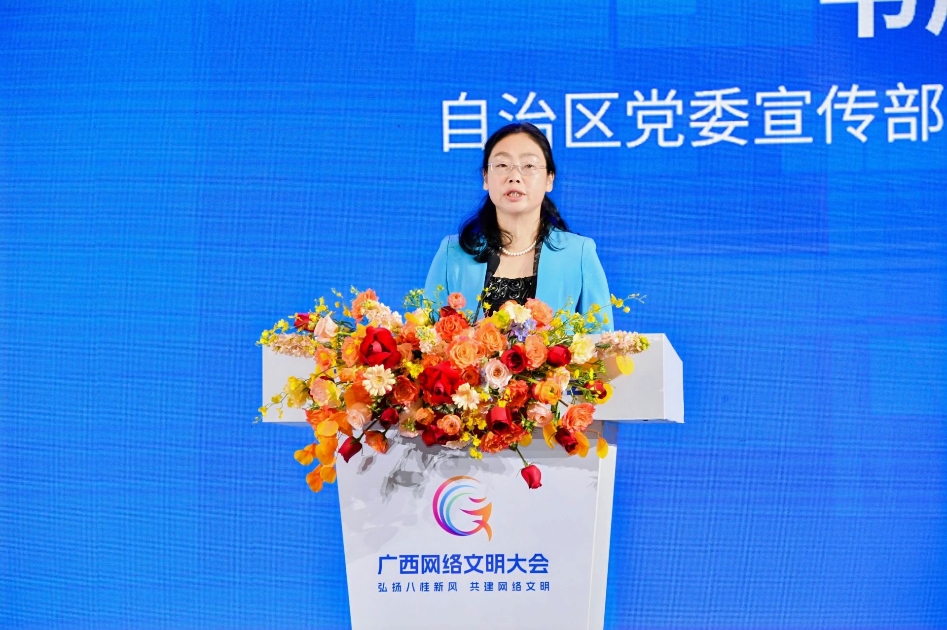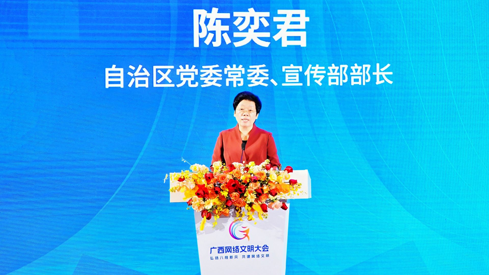 自治區黨委常委、宣傳部部長陳奕君宣讀自治區黨委書記劉寧對廣西網絡文明大會的批示并作主旨演講。